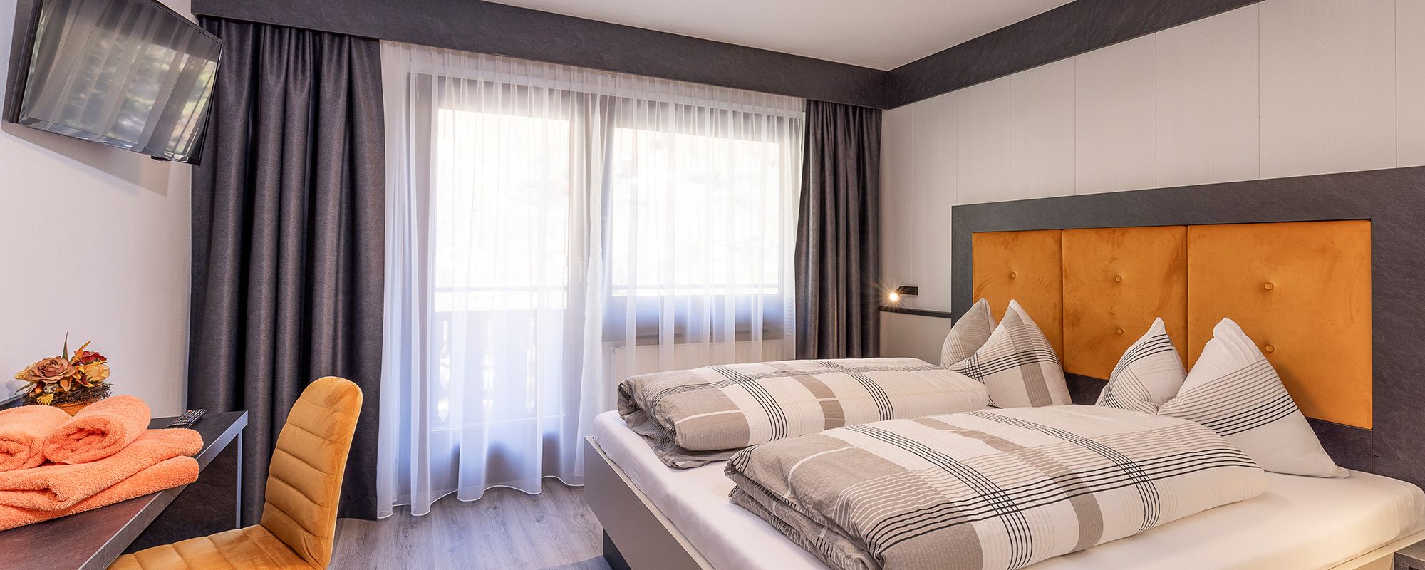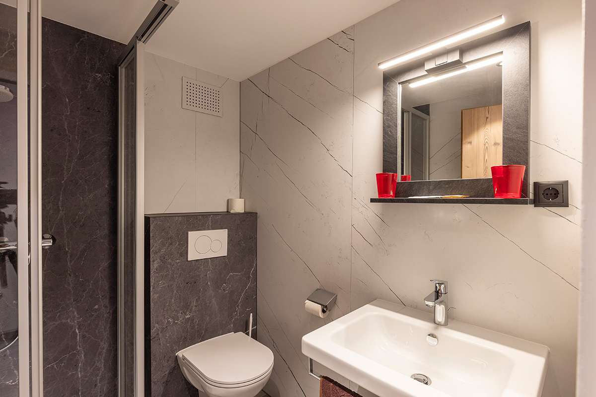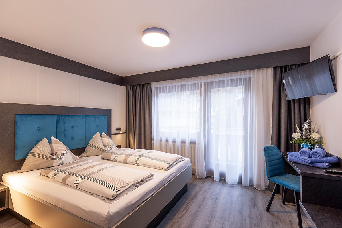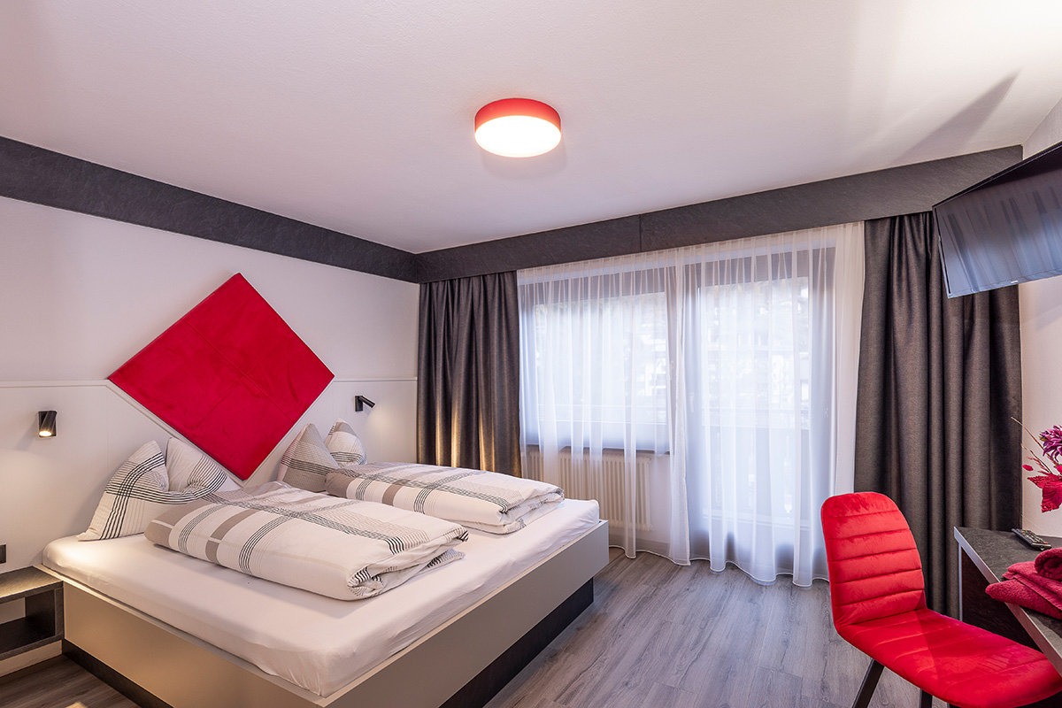 Das Doppelzimmer verfügt über ein bequemes Doppelbett mit indirekter Beleuchtung am Betthaupt sowie zwei Nachttische. Für zusätzlichen Komfort sorgen ein Schreibtisch mit Ablagefläche und ein offener Kleiderschrank mit Fächern und Kleiderstange. Ein Kofferbock ist ebenfalls vorhanden. Das Badezimmer ist mit Dusche, WC und Waschbecken ausgestattet. Eine kleine gemütliche Sitzecke rundet das Raumangebot ab. Das Zimmer eignet sich ideal für Paare oder Alleinreisende, die eine durchdachte und stilvolle Unterkunft suchen.