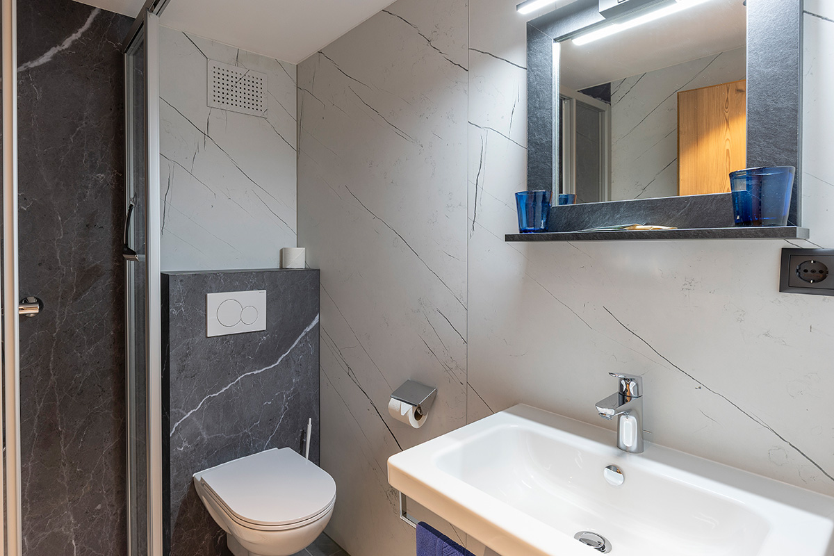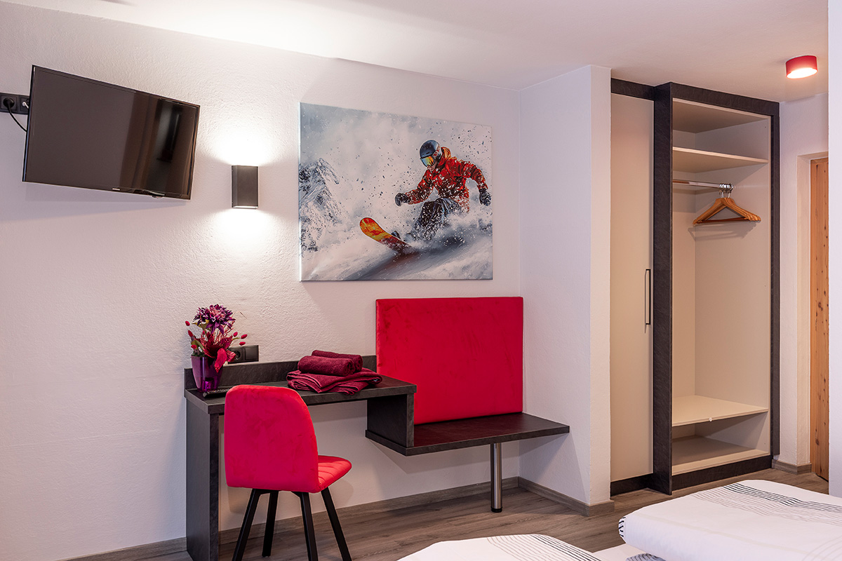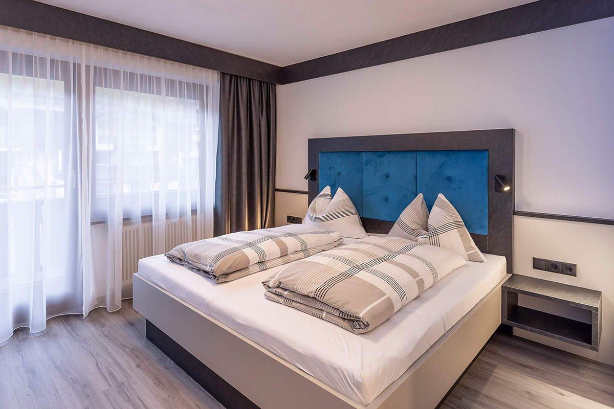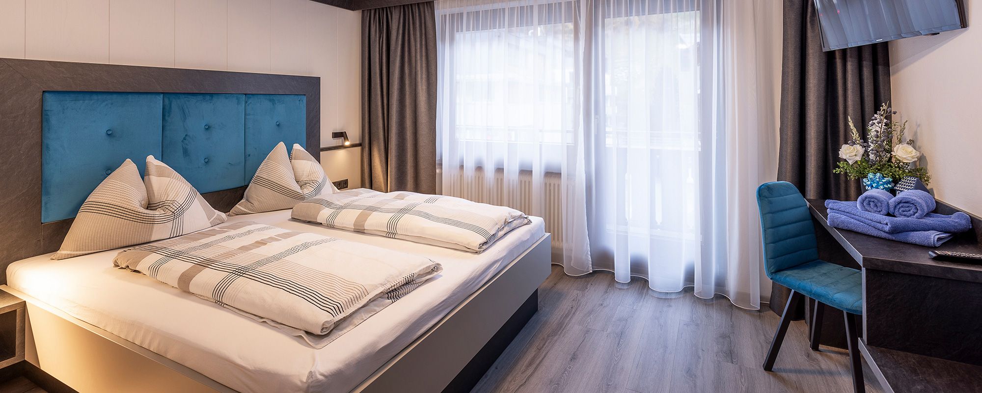 Das Doppelzimmer verfügt über ein bequemes Doppelbett mit indirekter Beleuchtung am Betthaupt sowie zwei Nachttische. Für zusätzlichen Komfort sorgen ein Schreibtisch mit Ablagefläche und ein offener Kleiderschrank mit Fächern und Kleiderstange. Ein Kofferbock ist ebenfalls vorhanden. Das Badezimmer ist mit Dusche, WC und Waschbecken ausgestattet. Eine kleine gemütliche Sitzecke rundet das Raumangebot ab. Das Zimmer eignet sich ideal für Paare oder Alleinreisende, die eine durchdachte und stilvolle Unterkunft suchen.